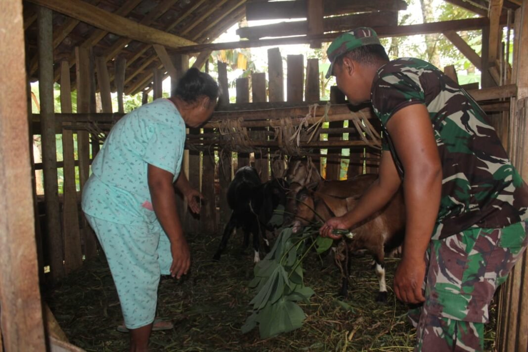 Ibu Ratini yang tengah menyiapkan pakan tampak sumringah. Ia tak menyangka kandang kecilnya didatangi prajurit berseragam loreng. Dengan mata berbinar, ia menunjukkan satu per satu kambing peliharaannya—seakan memperkenalkan anggota keluarga sendiri.