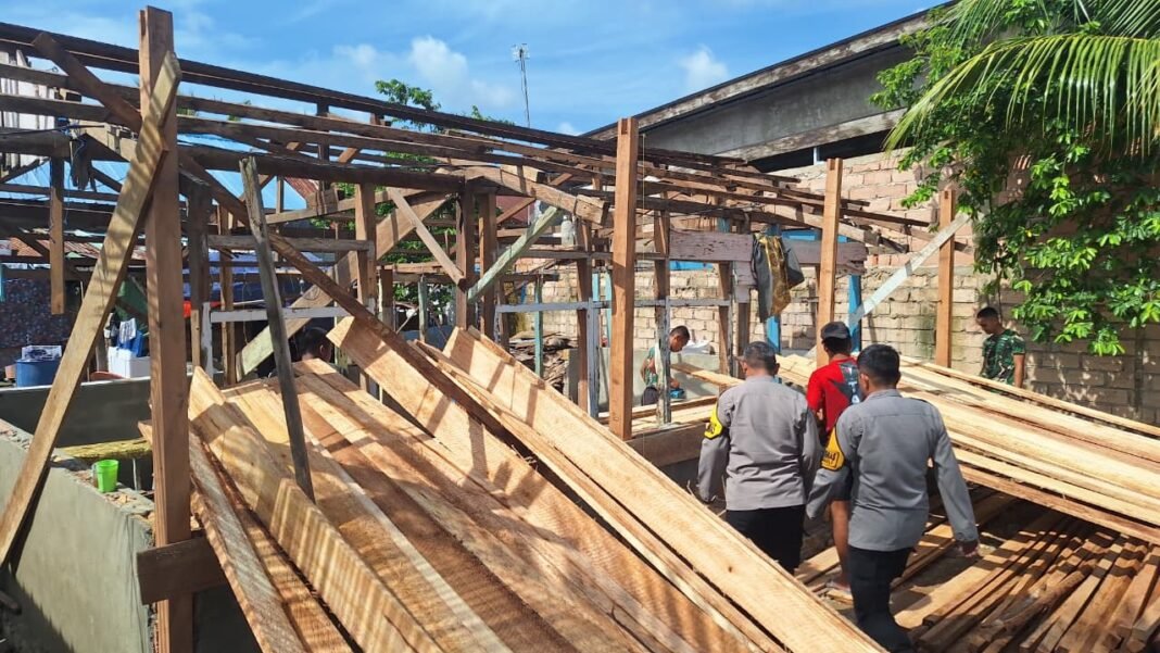 Kendari – Semangat gotong royong terpancar nyata di Kelurahan Petoaha saat personel Satgas TMMD ke-127 Kodim 1417/Kendari bersama Bhabinkamtibmas terjun langsung mengolah kayu dan menyusun rangka bangunan rumah warga, Senin (2/3).