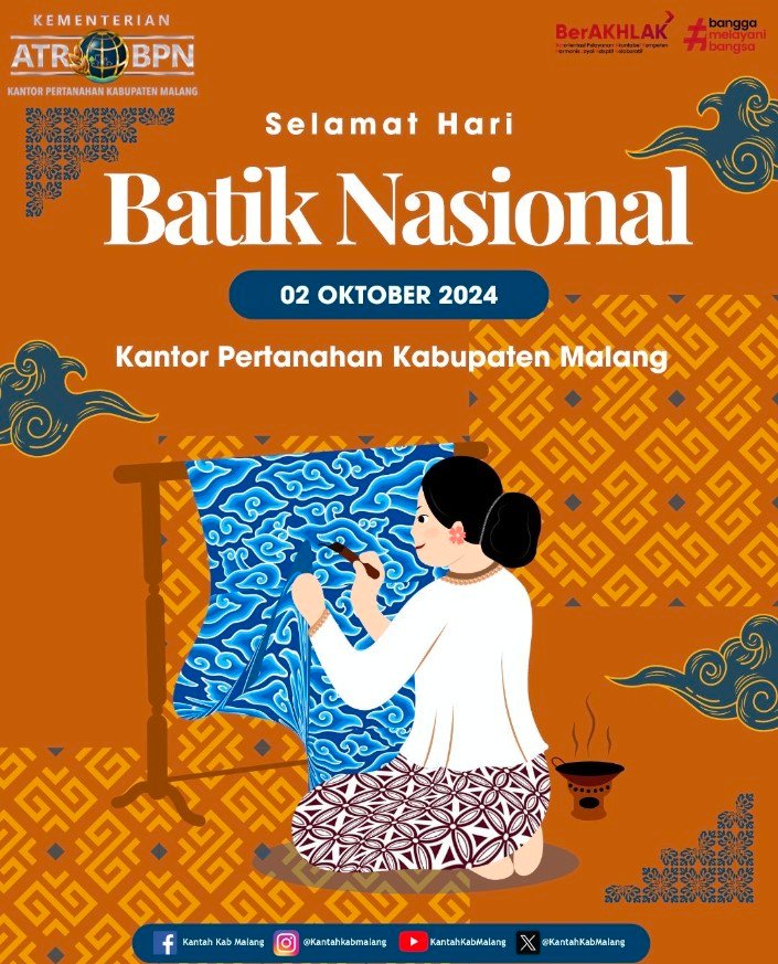 Sebagai simbol warisan budaya tak benda, batik telah diakui oleh UNESCO dan menjadi kebanggaan nasional yang patut kita junjung tinggi. Pada kesempatan ini, Kantor Pertanahan Kabupaten Malang mengajak masyarakat untuk terus mengenakan batik dalam kehidupan sehari-hari sebagai wujud cinta terhadap budaya bangsa.