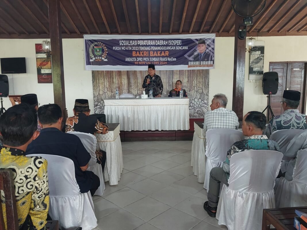 Pesisir Selatan, investigasi.news-Anggota Komisi IV Dewan Perwakilan Rakyat Daerah (DPRD) Provinsi Sumatera Barat (Sumbar) dari Fraksi Partai Nasdem, Bakti Bakar, gelar sosialisasi Peraturan Daerah (Perda) nomor 4 tahun 2023 tentang penanggulangan bencana.