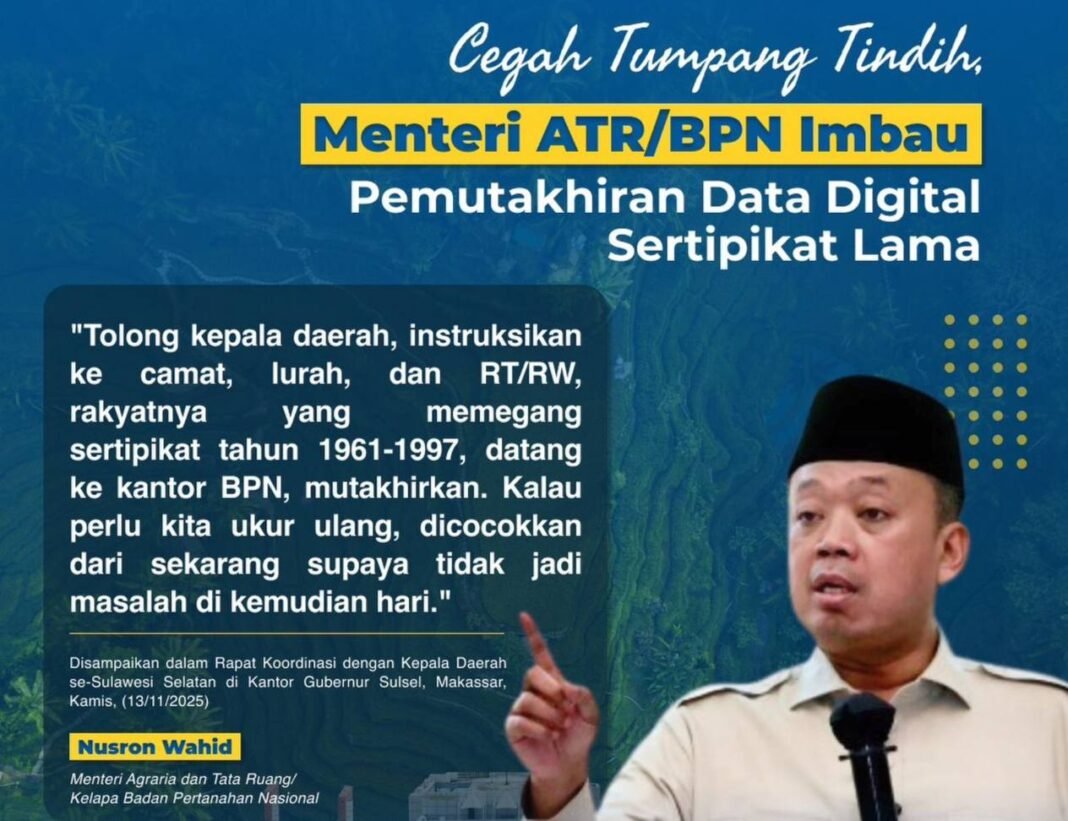 Nasional- Kementerian Agraria dan Tata Ruang/Badan Pertanahan Nasional (ATR/BPN) tengah menggencarkan program pemutakhiran data pertanahan secara digital. Menteri ATR/Kepala BPN, Nusron Wahid, mengimbau masyarakat yang memiliki sertipikat tanah terbitan tahun 1961 hingga 1997 untuk segera mendatangi kantor pertanahan setempat.