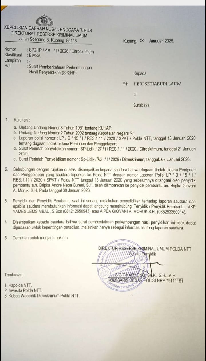 Direktorat Reserse Kriminal Umum (Ditreskrimum) Polda NTT, pada awal Februari 2026, secara resmi menerbitkan Surat Pemberitahuan Perkembangan Hasil Penyelidikan (SP2HP) terbaru serta Undangan Klarifikasi kepada pihak pelapor, sebagai bagian dari tindak lanjut proses penyelidikan perkara tersebut.