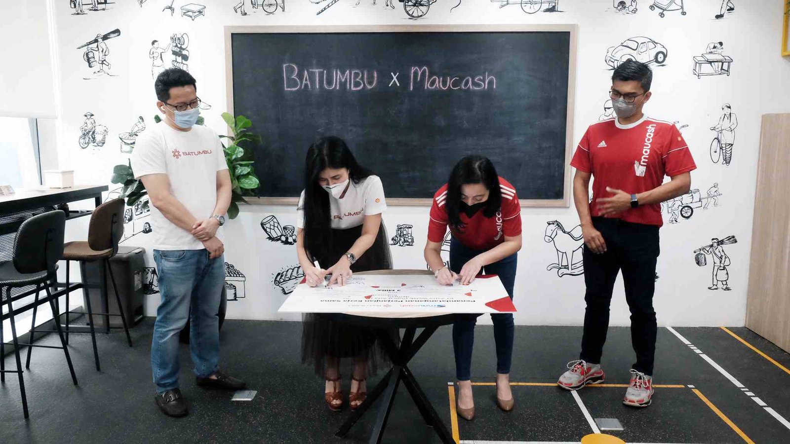 Simbolis penandatanganan kerja sama Batumbu dan Maucash yang dilakukan oleh CEO Batumbu, Jenny Wiriyanto (kedua dari kiri) dan CEO Maucash, Rina Apriana (kedua dari kanan) yang disaksikan oleh Direktur Batumbu, Reza Perazi Armadi dan Direktur Maucash Freddy Lee pada Jumat (03/06/2021) yang dilaksanakan di Kantor Batumbu di Kawasan Mega Kuningan, Jakarta Selatan.