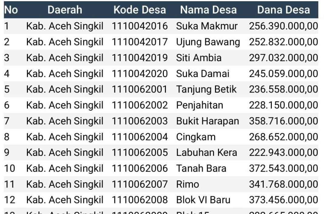 ‎Seperti contoh Kampong Ujung Bawang, Kecamatan Singkil di mana pada Tahun 2025 yang lalu Kampong tersebut menerima dana desa sekitar Rp.702 juta rupiah, namun pada Tahun 2026 ini Kampong Ujung Bawang turun drastis menjadi sekitar Rp. 252 Juta saja.