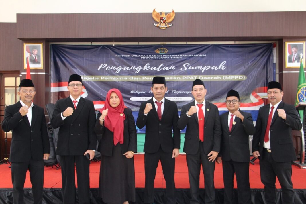 Malang, investigasi.news – 4 Februari 2026, Kantor Wilayah Badan Pertanahan Nasional (BPN) Provinsi Jawa Timur melaksanakan pelantikan dan pengangkatan sumpah Majelis Pengawas dan Pembina Pejabat Pembuat Akta Tanah (PPAT) Daerah. Kegiatan ini dilaksanakan secara daring dan diikuti oleh seluruh Kantor Pertanahan kabupaten/kota se-Jawa Timur, termasuk Kantor Pertanahan Kabupaten Malang.