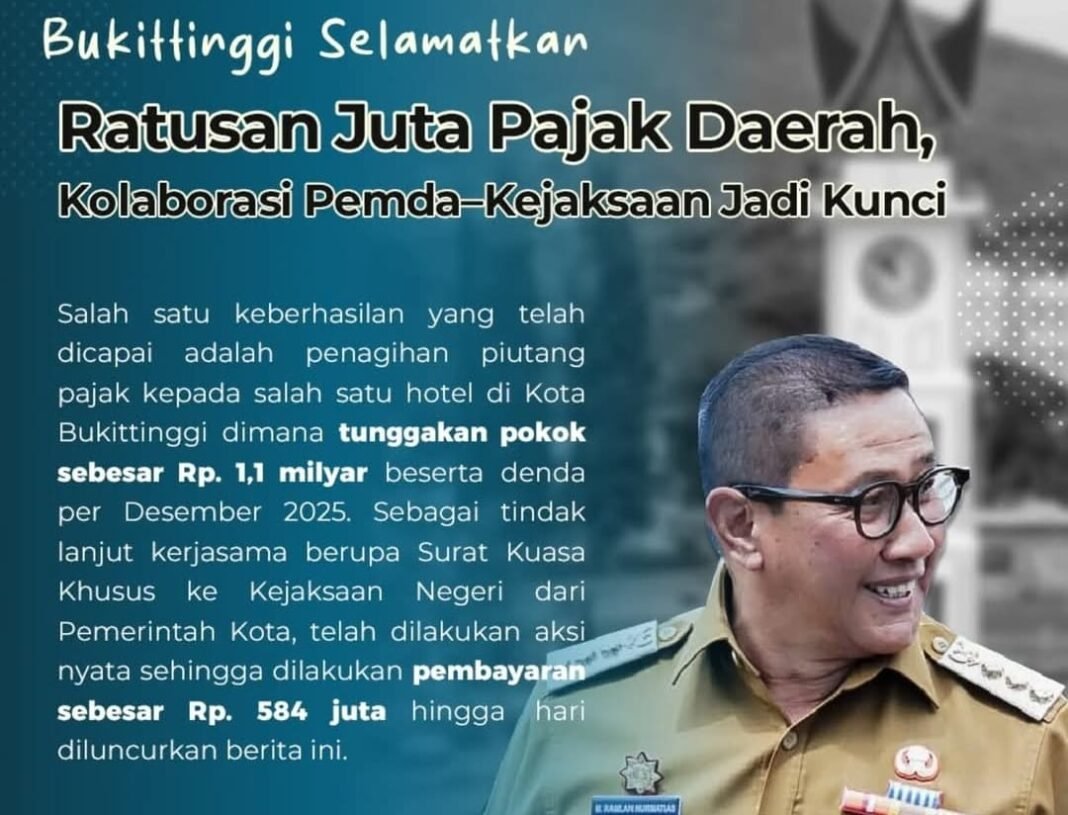 Bukittinggi — Pemerintah Kota Bukittinggi mencatat kemajuan signifikan dalam upaya pengamanan keuangan daerah dan penegakan kepatuhan pajak. Kemajuan ini merupakan hasil kerjasama Pemerintah Daerah dengan Kejaksaan Negeri Kota Bukittinggi selaku Jaksa Pengacara Negara (JPN).