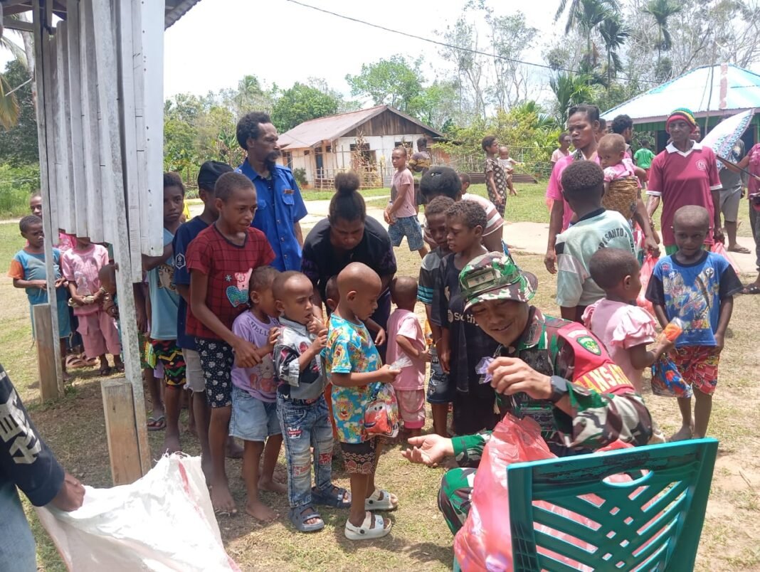 Selain pembagian sembako, Letkol Bayu juga memberikan bingkisan kepada anak-anak sebagai bentuk perhatian terhadap generasi muda di Kampung Yibin. Bingkisan yang berisi makanan ringan dan perlengkapan sekolah ini disambut antusias oleh anak-anak dan orang tua mereka, yang merasa tersentuh atas kepedulian aparat TNI terhadap kebutuhan mereka.