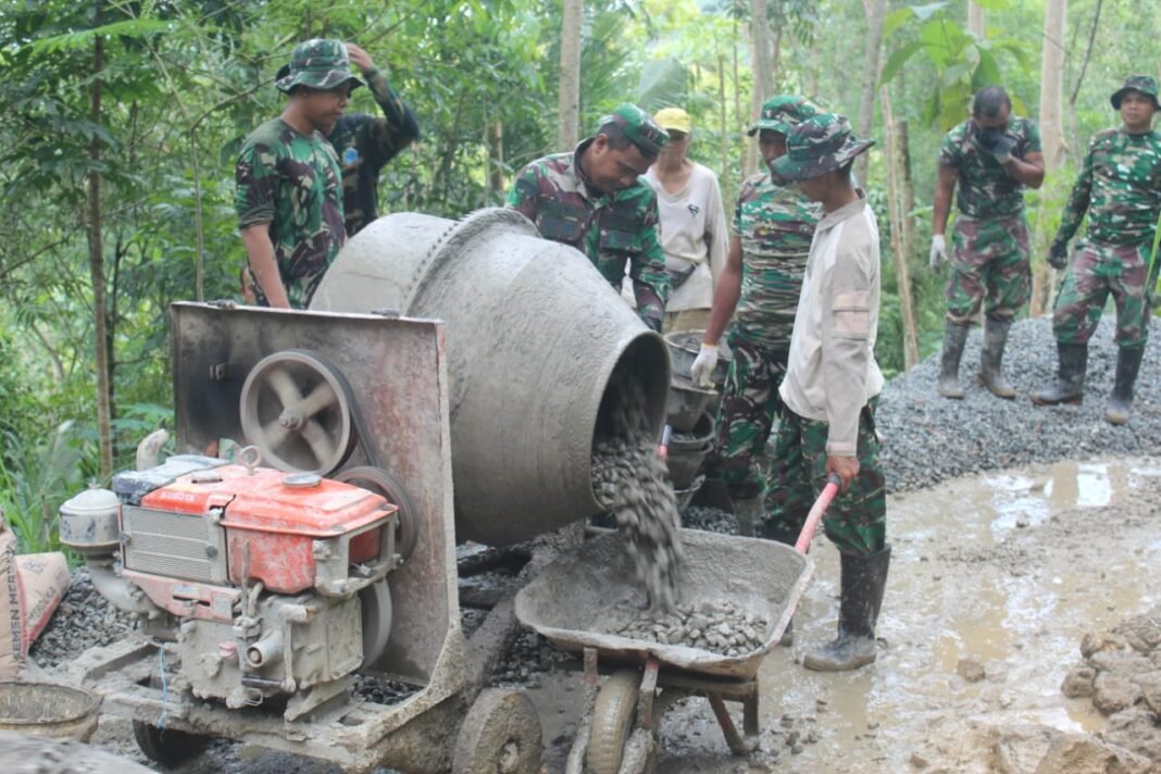 Kerja sama terjalin tanpa sekat. Prajurit dan warga bergantian mengangkut adukan, meratakan permukaan, hingga memastikan setiap jengkal jalan terbentuk kokoh. Dari tanah yang sebelumnya becek dan sulit dilalui, kini perlahan terbentang akses yang lebih kuat, menjadi urat nadi baru bagi aktivitas masyarakat.