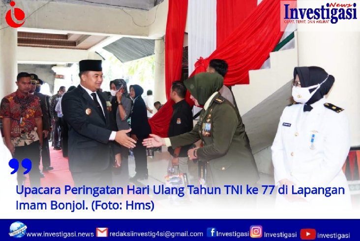Dharmasraya, investigasi.news-Bupati Sutan Riska Tuanku Kerajaan, bersama Ketua DPRD Dharmasraya, Pariyanto, Dandim 0310/SSD, Letkol Andik Hendra Sandi, dan Kapolres Dharmasraya, AKBP Nurhadiansyah, hadiri Upacara Peringatan Hari Ulang Tahun (HUT) Tentara Nasional Indonesia (TNI) ke 77 di Lapangan Imam Bonjol, Padang, Rabu (05/10/2022).