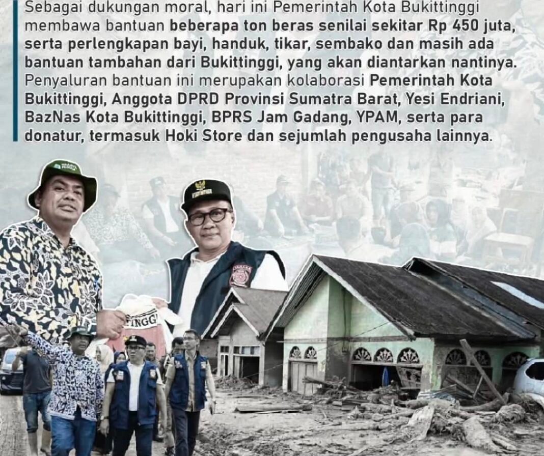 “Semua bantuan ini kami tujukan untuk masyarakat yang membutuhkan. Pemerintah Bukittinggi akan selalu hadir dan berupaya memberikan solusi atas bencana di Sumatra Barat. Terima kasih kepada seluruh pihak yang telah menyalurkan bantuan melalui pemerintah daerah. Atas nama Pemerintah Bukittinggi, kami menyampaikan bela sungkawa yang sedalam-dalamnya dan berharap kondisi segera pulih” ujarnya.