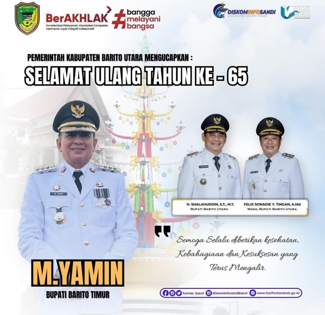 Muara Teweh, Investigasi. News– Pemerintah Kabupaten Barito Utara menyampaikan ucapan selamat ulang tahun ke-65 pada 6 November 2025 kepada Bapak M. Yamin, Bupati Barito Timur. Ucapan tersebut disampaikan melalui berbagai saluran komunikasi, termasuk media sosial dan website resmi pemerintah daerah.