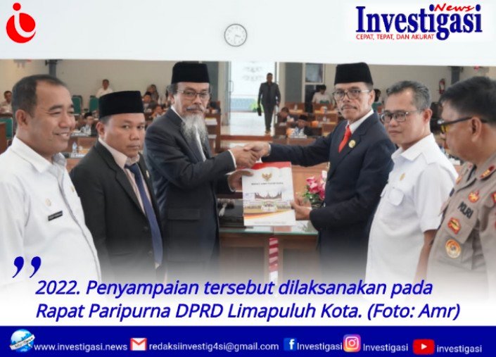 Limapuluh Kota, Investigasi.news – Total 48 jawaban disampaikan Bupati Limapuluh Kota Safaruddin Dt.Bandaro Rajo terkait pandangan Umum Delapan Fraksi di DPRD Limapuluh Kota atas penyampaian Nota Anggaran Pendapatan Belanja Daerah – Perubahan (APBD-P) Kabupaten Limapuluh Kota Tahun Anggaran 2022. Penyampaian tersebut dilaksanakan pada Rapat Paripurna DPRD Limapuluh Kota di ruang sidang utama DPRD, Rabu (07/09/2022). Rapat paripurna sebelumnya dibuka oleh Wakil Ketua DPRD Syamsul Mikar, turut dihadiri Bupati Limapuluh Kota Safaruddin Dt. Bandaro Rajo, Wakil Ketua DPRD Wendi Chandra serta sejumlah anggota DPRD, jajaran Forkopimda serta Kepala Perangkat Daerah di Limapuluh Kota.