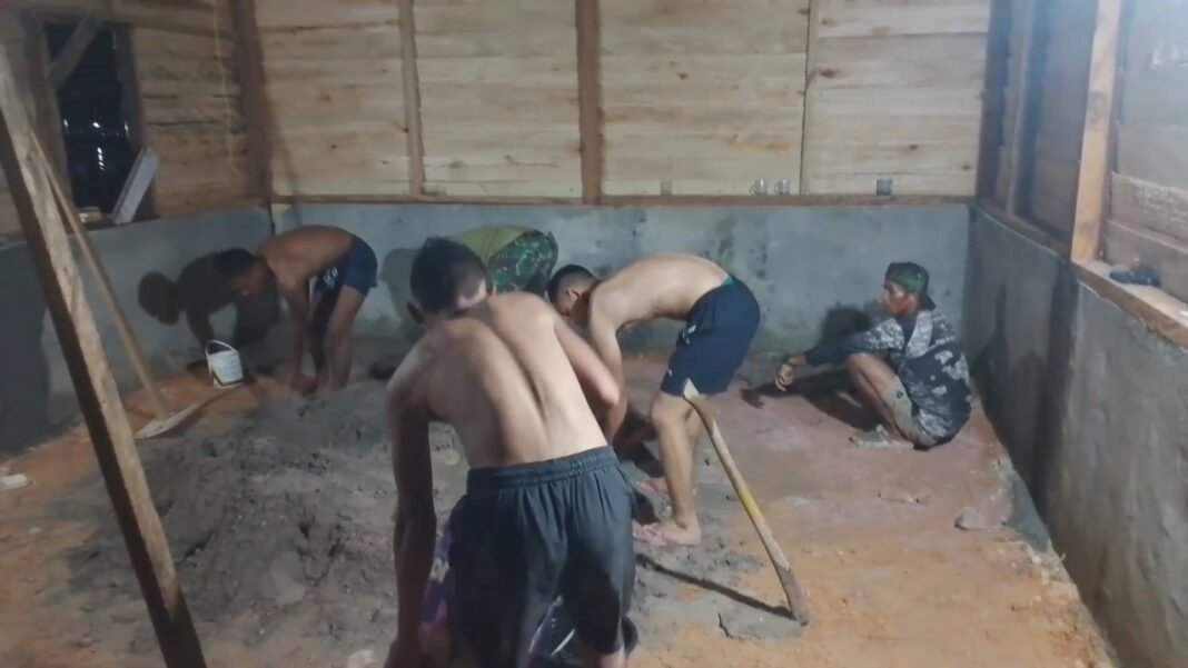 Para prajurit bahu-membahu melaksanakan pekerjaan fisik, mulai dari pemasangan rangka kayu bagian atas hingga proses perabatan atau pemeluran lantai gedung.