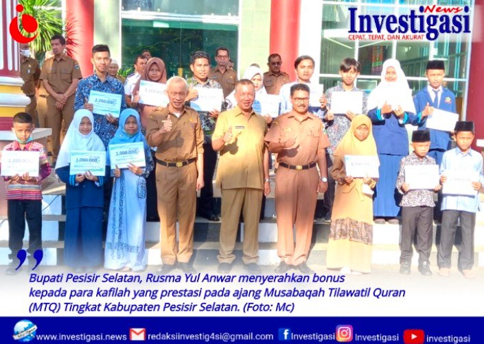 Pesisir Selatan, Investigasi.news-Bupati Pesisir Selatan, Rusma Yul Anwar menyerahkan bonus kepada para kafilah yang prestasi pada ajang Musabaqah Tilawatil Quran (MTQ) Tingkat Kabupaten Pesisir Selatan di Kecamatan Ranah Ampek Hulu Tapan 2022.