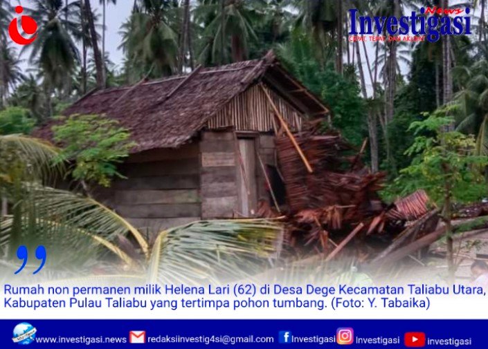 Maluku Utara, Investigasi.News – Akibat Angin kencang, sebuah rumah non permanen milik warga di Desa Dege Kecamatan Taliabu Utara, Kabupaten Pulau Taliabu (Pultab) Maluku Utara tertimpa Pohon Kelapa, pada Minggu (8/1/23) malam sekira pukul 22:00 Wit.