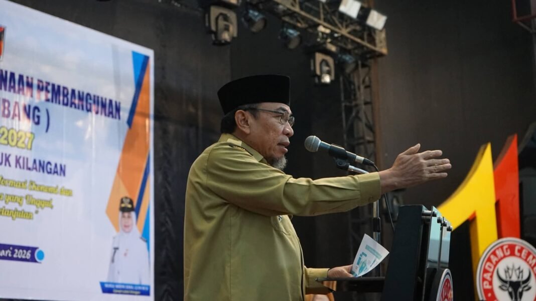 Padang- Wakil Wali Kota Padang, Maigus Nasir memberikan penekanan keras terkait integritas dan kualitas pelayanan publik saat membuka Musyawarah Perencanaan Pembangunan (Musrenbang) Kecamatan Lubuk Kilangan di Gedung Serba Guna PT Semen Padang, Indarung, Senin (9/2/2026).