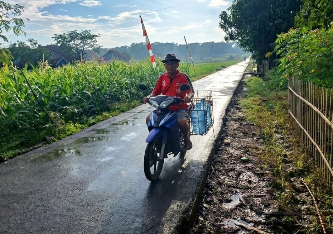 “Kalau sekarang mengantar pesanan galon jadi mudah. Kalau dulu, motor terpaksa diparkir di ujung jalan, terus galonnya harus dipanggul sambil jalan kaki sampai ke rumah pelanggan,” kenangnya.