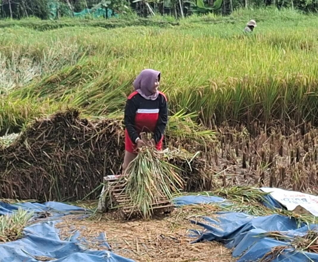 Di tengah hamparan padi yang menguning, nampak Warti (30), salah satu warga setempat, dengan cekatan mengayunkan sabit memanen padi. Meski sang suami sedang merantau mengadu nasib di Jakarta, Warti tidak patah arang. Dibantu dua rekan perempuannya, ia bahu-membahu menyelesaikan panen di sawah miliknya.