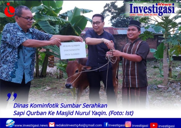 Padang, Investigasi.news-Dinas Komunikasi informatika dan Statistik Provinsi Sumatera Barat (Diskominfotik Prov Sumbar) menyerahkan satu ekor sapi qurban ke Masjid Nurul Yaqin, Lolong Belanti, Kecamatan Padang Utara, Kamis (8/7/2022).