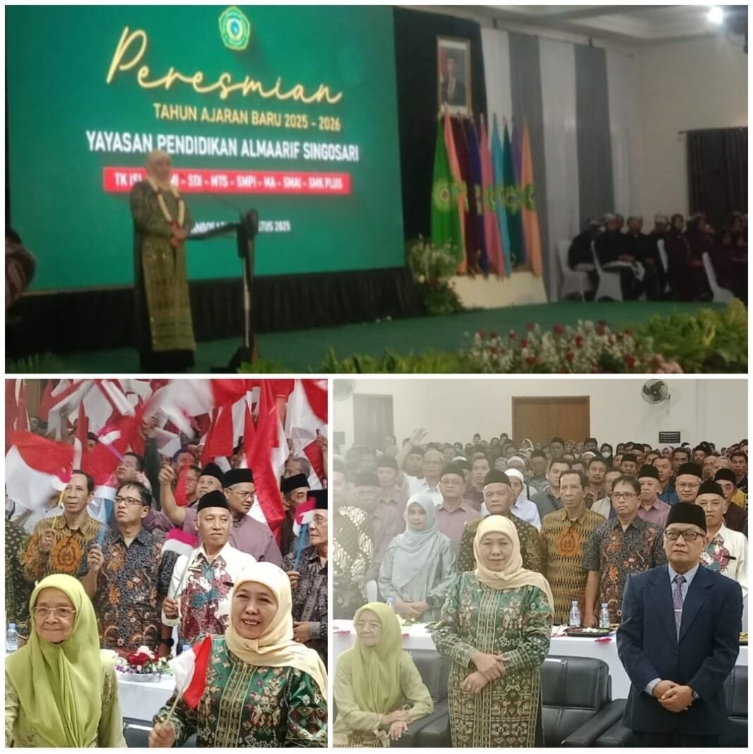 Malang, Investigasi.news – Suasana penuh semangat dan kebanggaan membalut pembukaan tahun ajaran baru 2025/2026 di Yayasan Pendidikan Al-Ma’arif Singosari, Kabupaten Malang, Sabtu (9/8/2025). Acara ini menjadi momen istimewa dengan hadirnya Gubernur Jawa Timur, **Khofifah Indar Parawansa**, yang secara resmi membuka kegiatan, disambut gemuruh kibaran **1.202 bendera merah putih** dari para orang tua, wali murid, peserta didik baru, dan seluruh perangkat yayasan.