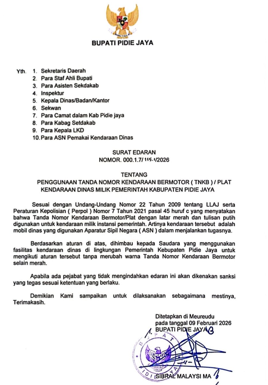 Pidie Jaya, Investigasi.news — Sorotan keras DPRK Pidie Jaya soal maraknya kendaraan dinas berpelat hitam akhirnya memaksa pemerintah daerah angkat suara. Pasca pemberitaan Investigasi.news yang mengungkap dugaan penyalahgunaan kendaraan negara, Bupati Pidie Jaya resmi menerbitkan Surat Edaran Nomor 000.1.7/115.1/2026 tentang kewajiban penggunaan Tanda Nomor Kendaraan Bermotor (TNKB) resmi pada seluruh kendaraan dinas milik Pemerintah Kabupaten Pidie Jaya.