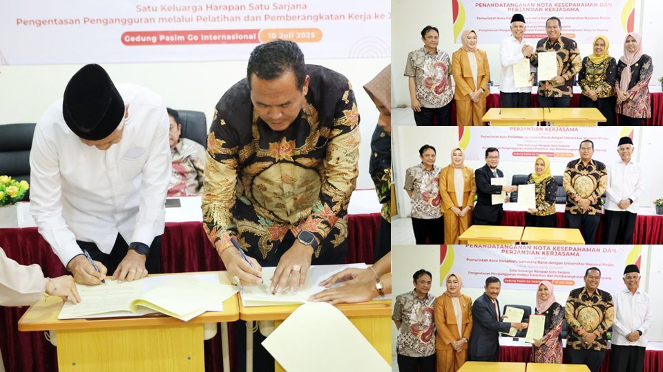 Kota Pariaman, investigasi.news- Wali Kota Pariaman Yota Balad Tanda tangani Memorandum of Understanding (MoU) dengan Universitas Nasional (UNAS) PASIM Bandung terkait Proram Unggulan Saga Saja (Satu Keluarga Satu Sarjana) Plus daerah yang dipimpinya, di Kampus UNAS PASIM, Bandung Provinsi Jawa Barat, Kamis (10/7/2025).