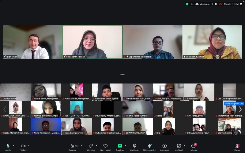 Padang, investigasi.news-10 September 2025 – Departemen Pariwisata Universitas Negeri Padang (UNP) kembali menyelenggarakan International Lecture Series dengan menghadirkan narasumber internasional. Kegiatan yang berlangsung secara daring melalui Zoom Meeting ini menghadirkan Mr. Iulian Virlan, CEO International Management Institute (IMI) Switzerland, sebagai pembicara utama.