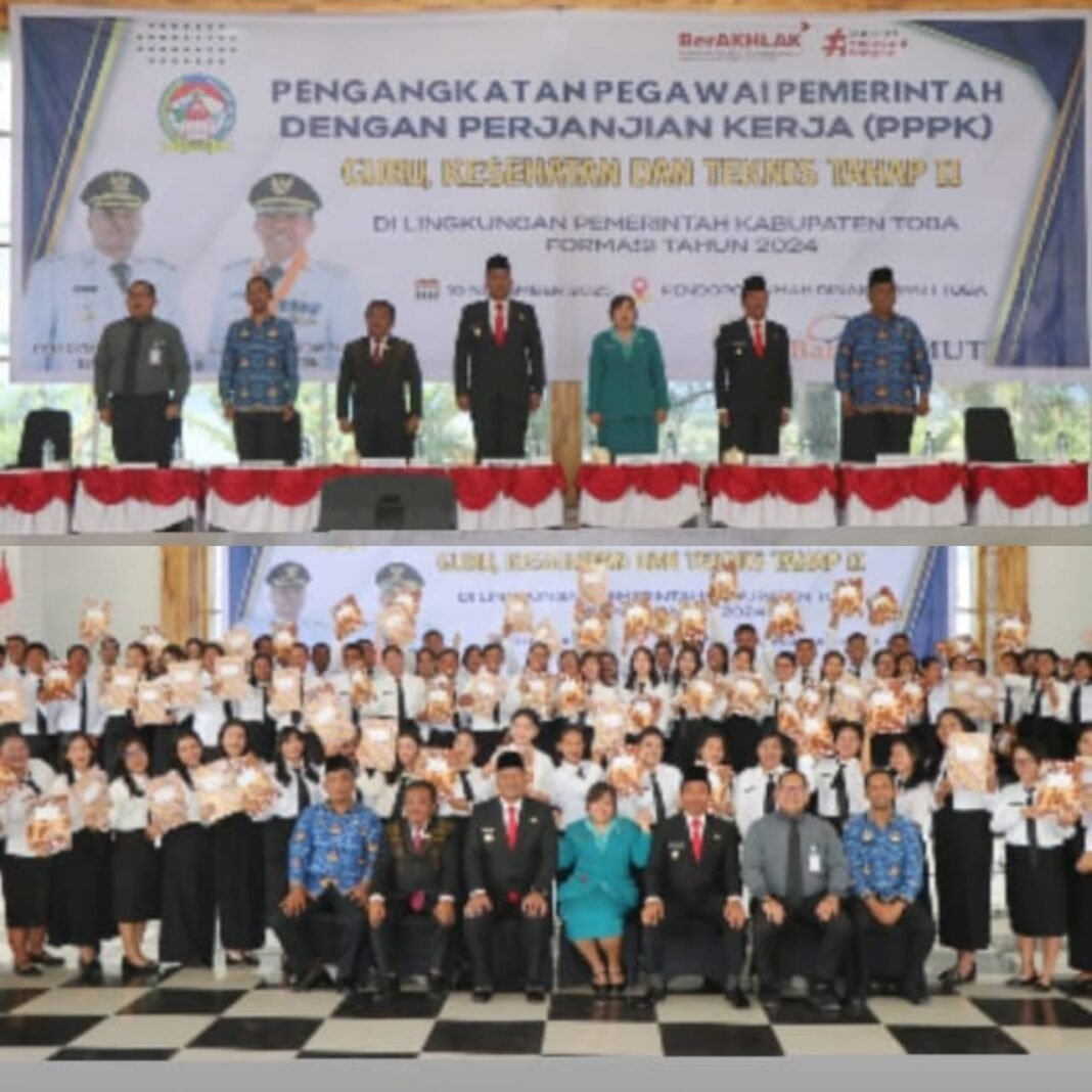 Toba, Investigasi.News – Bupati Toba Effendi Napitupulu bersama Wakil Bupati Toba Audi Murphy O. Sitorus, Ketua DPRD Toba Franshendrik Tambunan, Sekda Toba Paber Napitupulu, dan Ny. Astita Effendi Napitupulu selaku Ketua TP. PKK Kabupaten Toba bersama Kepala Bank Sumut Cabang Balige, menyerahkan SK PPPK (Pegawai Pemerintah dengan Perjanjian Kerja), Senin (10/11/2025) dinihari dipondopo rumah dinas Bupati Toba.