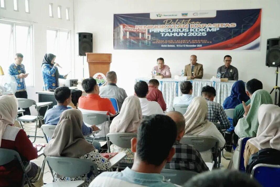 Solsel, investigasi.news-Solok Selatan Kementerian Koperasi dan UKM RI melalui Deputi Bidang Pengembangan SDM dan Talenta bekerja sama dengan Dinas Koperasi dan UKM Provinsi Sumatera Barat serta Dinas Perindustrian Koperasi UKM Solok Selatan menyelenggarakan Pelatihan Peningkatan Kompetensi SDM Pengurus Koperasi Desa/Kelurahan Merah Putih (KDKMP) se-Kabupaten Solok Selatan. Kegiatan ini dibuka Senin (10/11/2025) di Aula Dinas Tenaga Kerja dan Transmigrasi.
