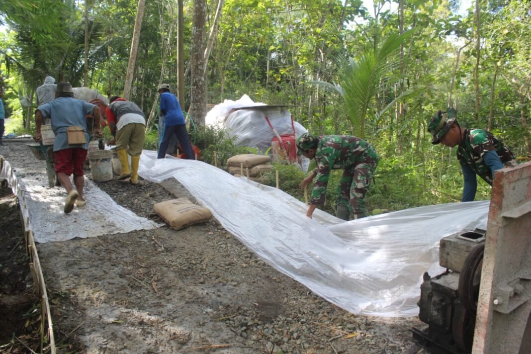 Sejak pagi hari, personel Satgas TMMD bersama warga desa bahu-membahu memasang begesting sebagai tahap awal pembangunan rabat beton yang akan menjadi urat nadi perekonomian dan akses kehidupan masyarakat setempat.