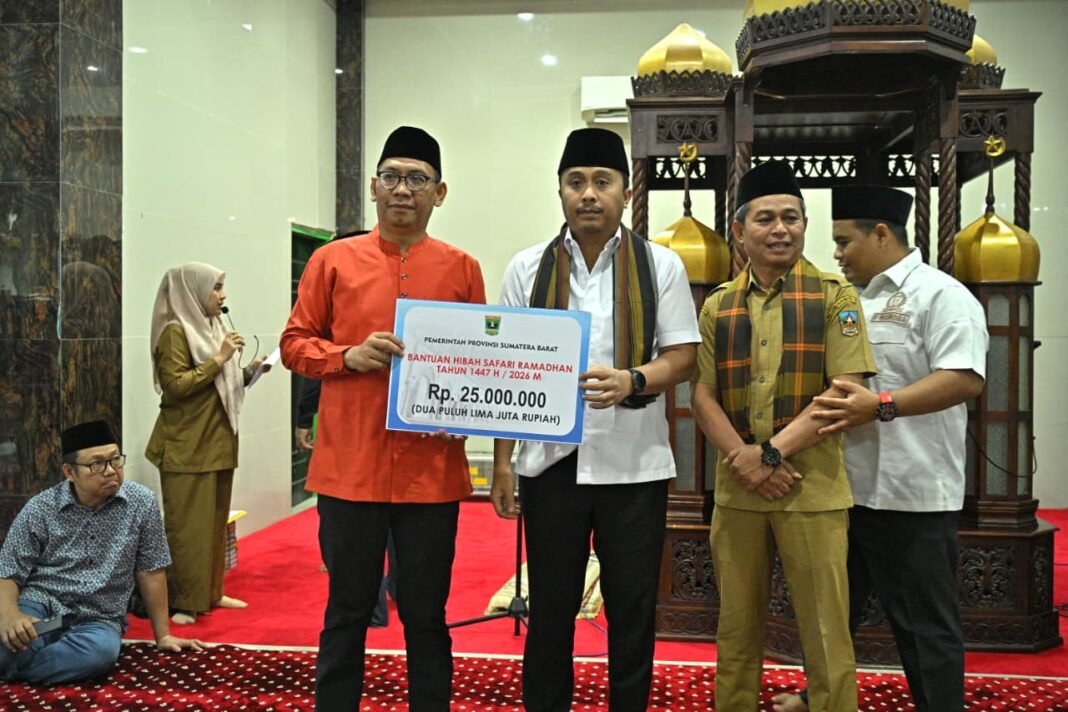 DHARMASRAYA — Wakil Gubernur Sumatera Barat (Wagub Sumbar), Vasko Ruseimy menyerahkan bantuan sebesar Rp25 juta kepada Masjid Nurul Huda di Nagari Sungai Kambut, Kecamatan Pulau Punjung, Kabupaten Dharmasraya, Selasa (10/3/2026). Bantuan tersebut disalurkan dalam rangka kegiatan Safari Ramadan Pemerintah Provinsi Sumbar tahun 2026.