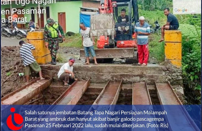 Dan Alhamdulilah salah satunya jembatan Batang Tapa Nagari Persiapan Malampah Barat yang ambruk dan hanyut akibat banjir galodo pascagempa Pasaman 25 Februari 2022 lalu, sudah mulai dikerjakan.