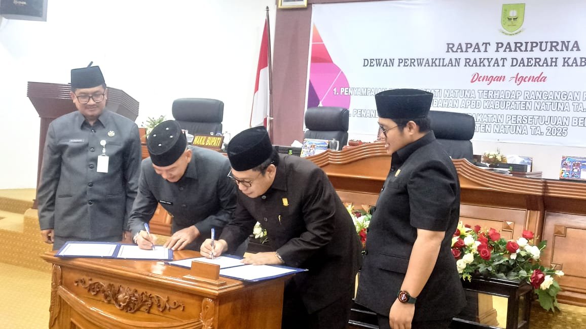 Ketua DPRD Kabupaten Natuna, Daeng Amhar yang didampingi oleh Wakil Ketua I, Daeng Ganda Rahmatullah menandatangani berita acara APBD Perubahan tahun 2024