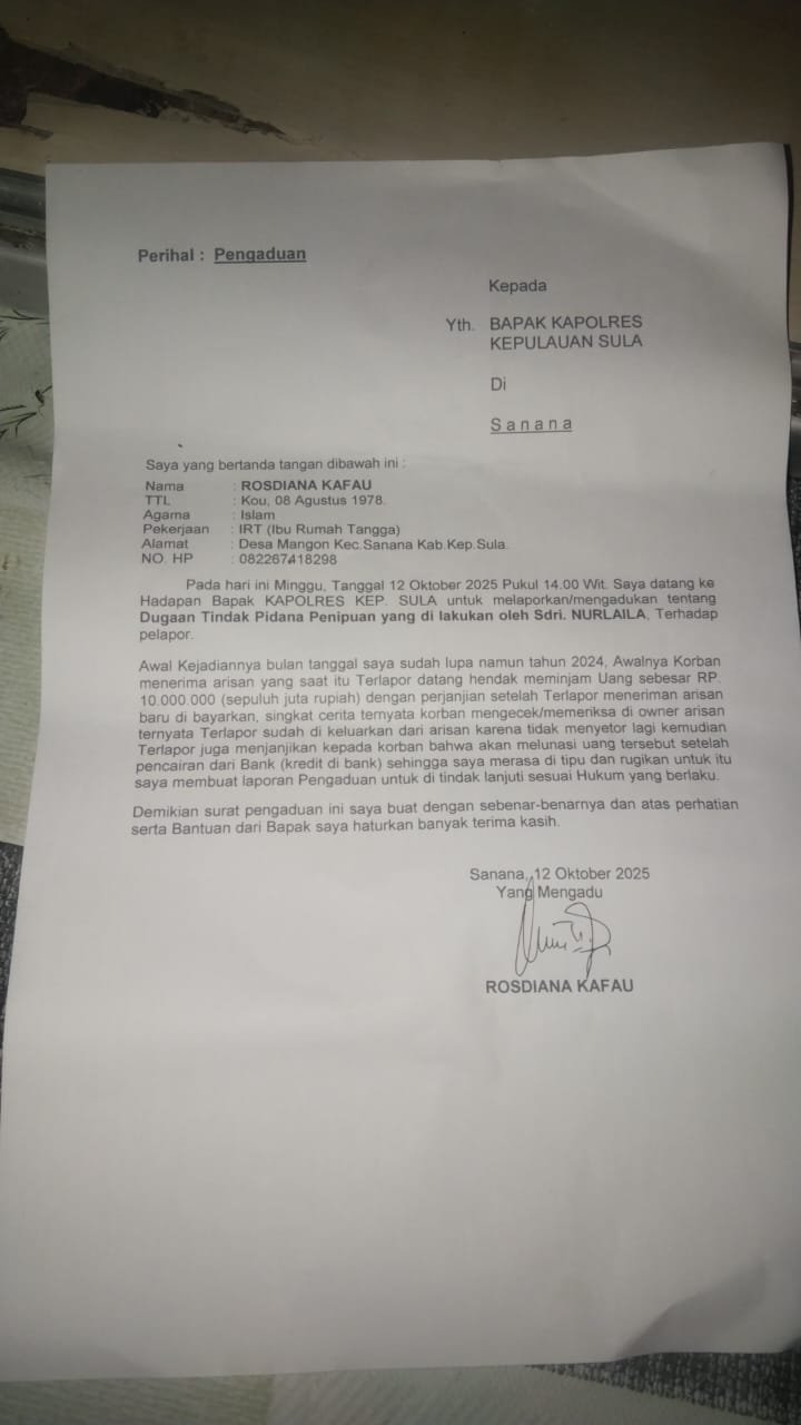 Dalam aduan kepada (Yth) Bapak Kapolres Sula, dengan gamblang Tante Os menceritakan kronologi hutang-piutang yang berujung pada dugaan tindak pidana PENIPUAN, awalnya Tante Os dapat arisan Rp 10 juta, uang tersebut dipinjam Teradu (Ibu Ela-red) dengan janji kalo dirinya dapat arisan yang sama uang tersebut dikembalikan, tapi ternyata Teradu dikeluarkan dari arisan karena tidak menunaikan kewajiban membayar, sehingga dikeluarkan oleh Owner arisan karena memang itu sudah menjadi kesepakatan, ketika hal tersebut dipersoalkan oleh Tante Os, Teradu meyakinkan Tante Os bahwa uang tersebut tetap akan dibayar dengan janji menunggu pencairan kredit di Bank, namun kemudian penurut pengakuan Pengadu (Tante Os-red) uang tersebut sampai kini belum dikembalikan.