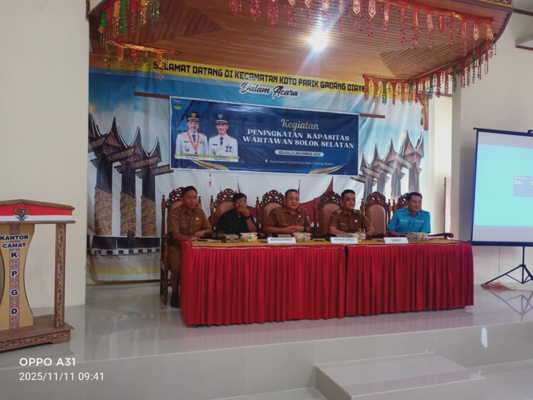 Solok Selatan, investigasi.news-12 November 2025 — Dinas Komunikasi dan Informatika (Diskominfo) Kabupaten Solok Selatan menggelar kegiatan Peningkatan Kapasitas Wartawan pada Selasa (11/11/2025) di Aula Kantor Camat Koto Parik Gadang Diateh. Kegiatan tersebut dibuka secara resmi oleh Pelaksana Tugas (Plt) Kepala Diskominfo Solok Selatan, Irwanesa.