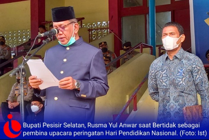 Pessel, Investigasi.newss-Pesisir Selatan-Upacara peringatan Hari Pendidikan Nasional tahun 2022 di GOR H.Ilyas Yakup Painan, Jumat (13/5) berjalan khidmat. Bertidak sebagai pembina upacara peringatan Hari Pendidikan Nasional itu, Bupati Pesisir Selatan, Rusma Yul Anwar.