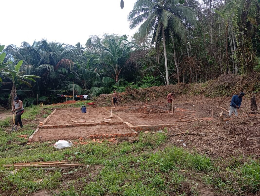 Personel yang terlibat dalam pekerjaan khusus untuk rumah ini telah membagi tugas secara terstruktur, mulai dari penggalian lubang penyangga, penimbunan pasir dan batu pecah sebagai dasar pondasi, hingga penataan bata merah sebagai struktur penyangga utama. Selain itu, material tambahan seperti kayu telah dipersiapkan dan diangkut dari pinggir dermaga ke lokasi kerja menggunakan traktor dengan gerobak modifikasi, untuk mendukung kelanjutan tahap konstruksi setelah pondasi selesai.