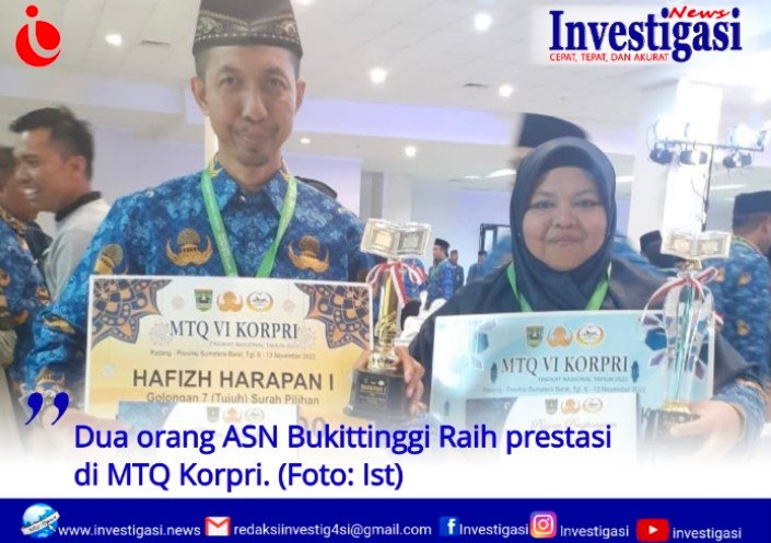 Bukittinggi, Investigasi.news – Dua orang ASN Kota Bukittinggi yang mewakili Sumatra Barat, berhasil meraih prestasi pada MTQ Korpri ke-6 tingkat nasional di Kota Padang, 6 hingga 13 November 2022.