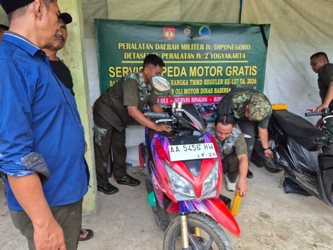 Kebumen – Kepedulian TNI terhadap masyarakat kembali diwujudkan melalui kegiatan sosial berupa servis dan ganti oli gratis bagi warga Desa Somagede. Kegiatan ini dilaksanakan oleh Denapal IV/2 Yogyakarta dalam rangka mendukung pelaksanaan TMMD Reguler ke-127 yang diselenggarakan oleh Kodim 0709/Kebumen Minggu (15/2/2026).
