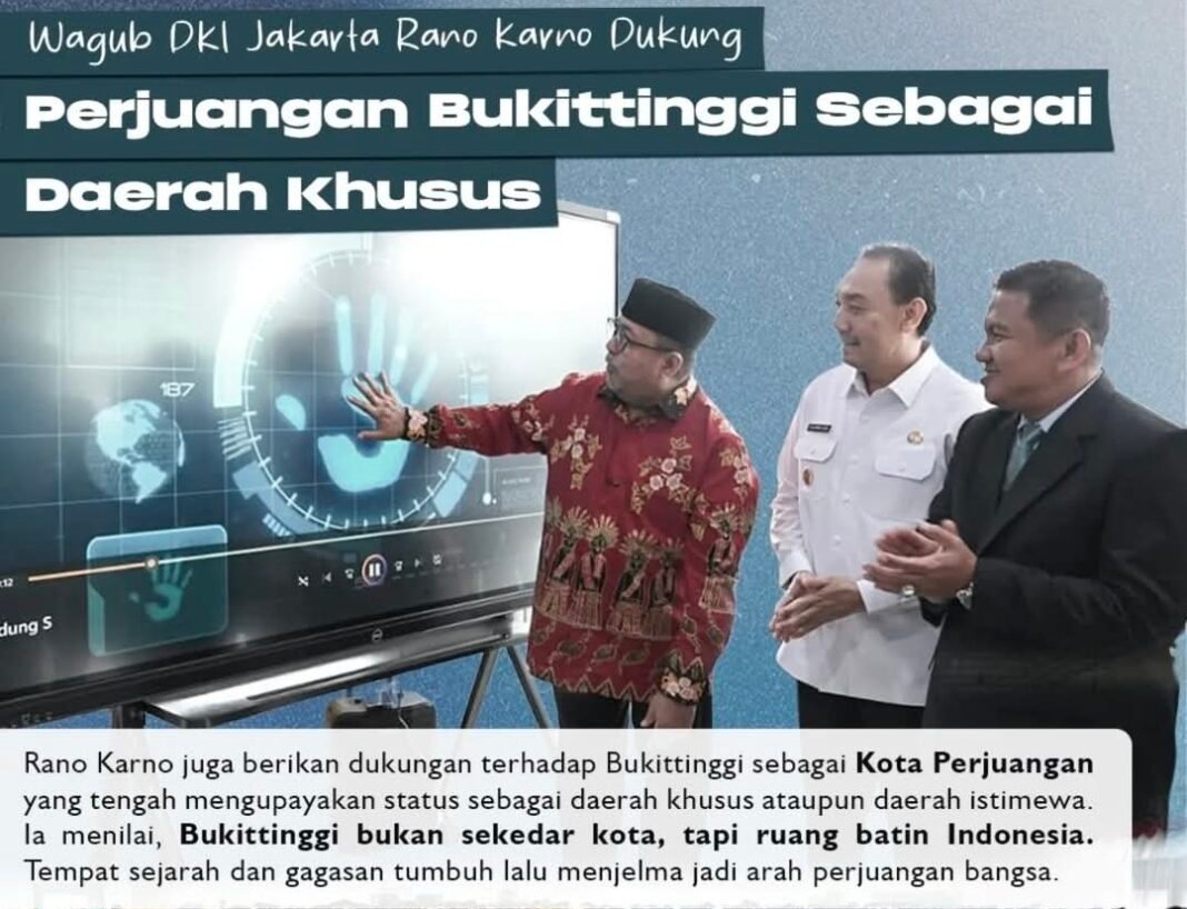 Rano Karno juga berikan dukungan terhadap Bukittinggi sebagai Kota Perjuangan yang tengah mengupayakan status sebagai daerah khusus ataupun daerah istimewa. Ia menilai, Bukittinggi bukan sekedar kota, tapi ruang batin Indonesia. Tempat sejarah dan gagasan tumbuh lalu menjelma jadi arah perjuangan bangsa.