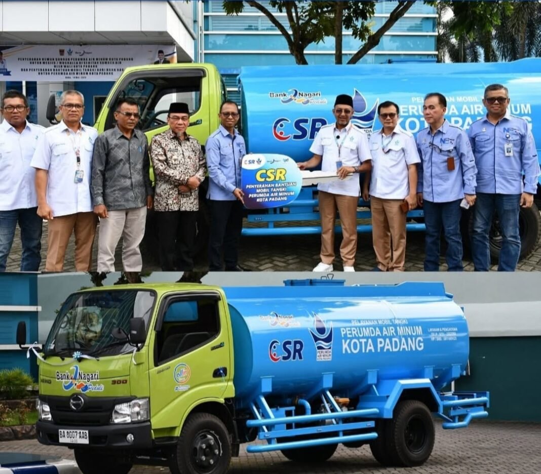 Padang, 14 Mei 2025 — Dalam rangka memperkuat pelayanan air bersih kepada masyarakat, Perusahaan Umum Daerah Air Minum (PERUMDA AM) Kota Padang menerima bantuan satu unit mobil tangki air dari Bank Nagari. Penyerahan bantuan tersebut dilakukan secara langsung oleh Direktur Keuangan Bank Nagari, Roni Edrian, didampingi oleh Kepala Cabang Bank Nagari Pasar Raya Padang, Hendri Gozari, kepada Direktur Utama PERUMDA AM Kota Padang.