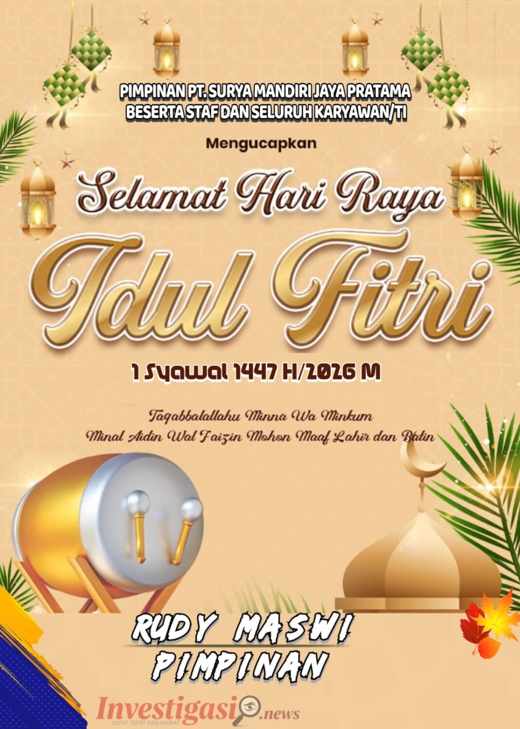 Mengucapkan Selamat Hari Raya Idul Fitri 1 Syawal 1447 H/2026 M Taqabbalallahu Minna Wa Minkum Minal Aidin Wal Faizin Mohon Maaf Lahir dan Batin RUDY MASWI PIMPINAN