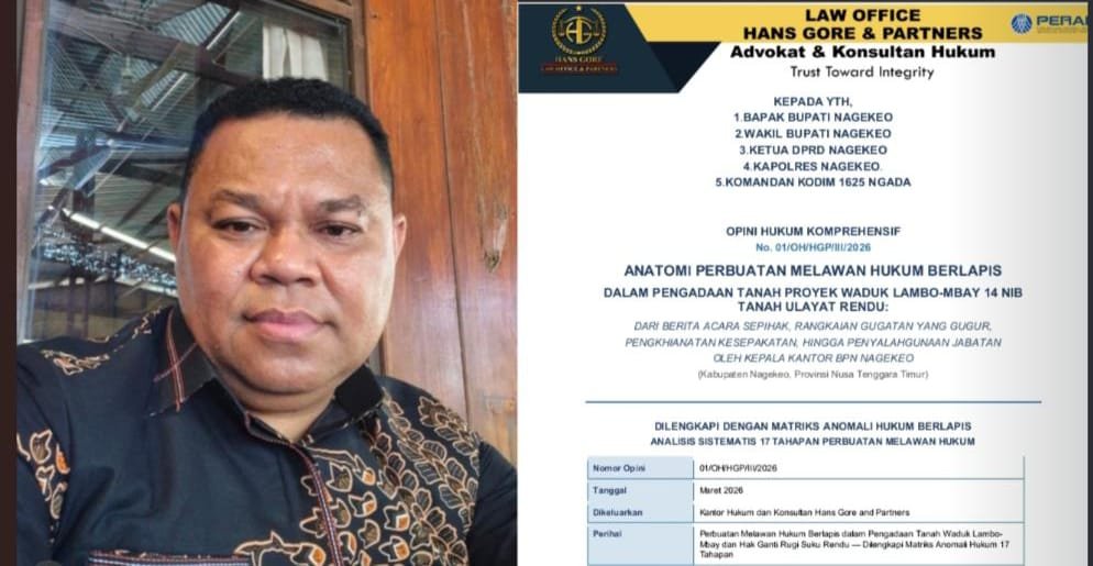 Temuan ini diperkuat oleh dokumen Opini Hukum Komprehensif bertajuk “Anatomi Perbuatan Melawan Hukum Berlapis dalam Pengadaan Tanah Proyek Waduk Lambo-Mbay 14 NIB Tanah Ulayat Rendu” yang diterbitkan Kantor Hukum dan Konsultan Hans Gore and Partners pada Maret 2026. Dokumen tersebut ditujukan kepada Bupati dan Wakil Bupati Nagekeo, Ketua DPRD Nagekeo, Kapolres Nagekeo, serta Dandim 1625 Ngada.