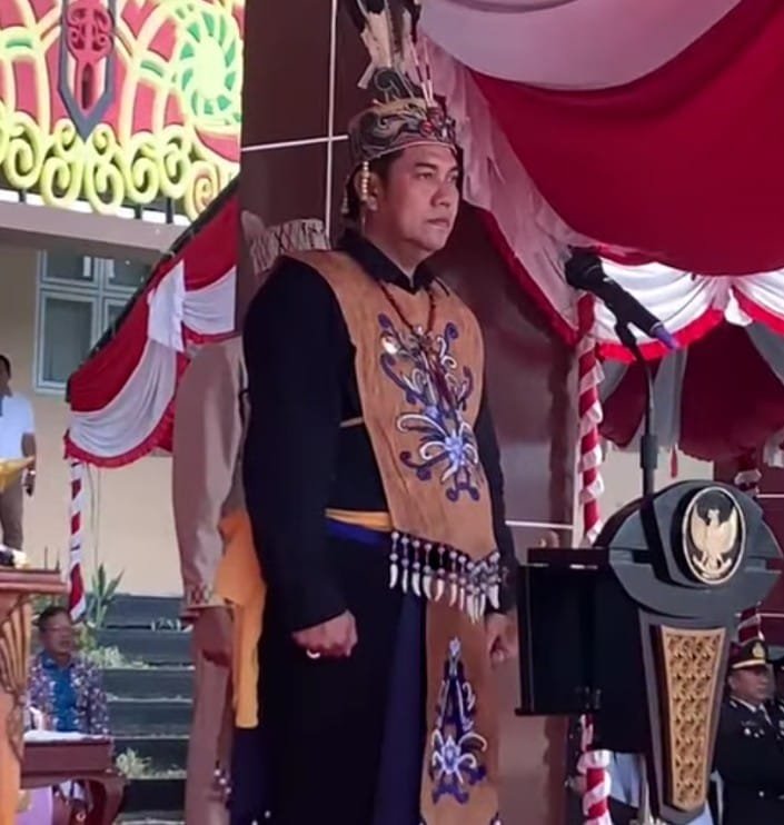 Menariknya, dalam momentum sakral tersebut, Wakil Bupati Pulang Pisau H. Ahmad Jayadikarta, S.IP., MAP., tampil mengenakan pakaian adat khas Dayak saat bertindak sebagai Inspektur Upacara. Penampilannya menjadi simbol penghormatan terhadap budaya lokal sekaligus wujud semangat nasionalisme yang berakar pada kearifan daerah.