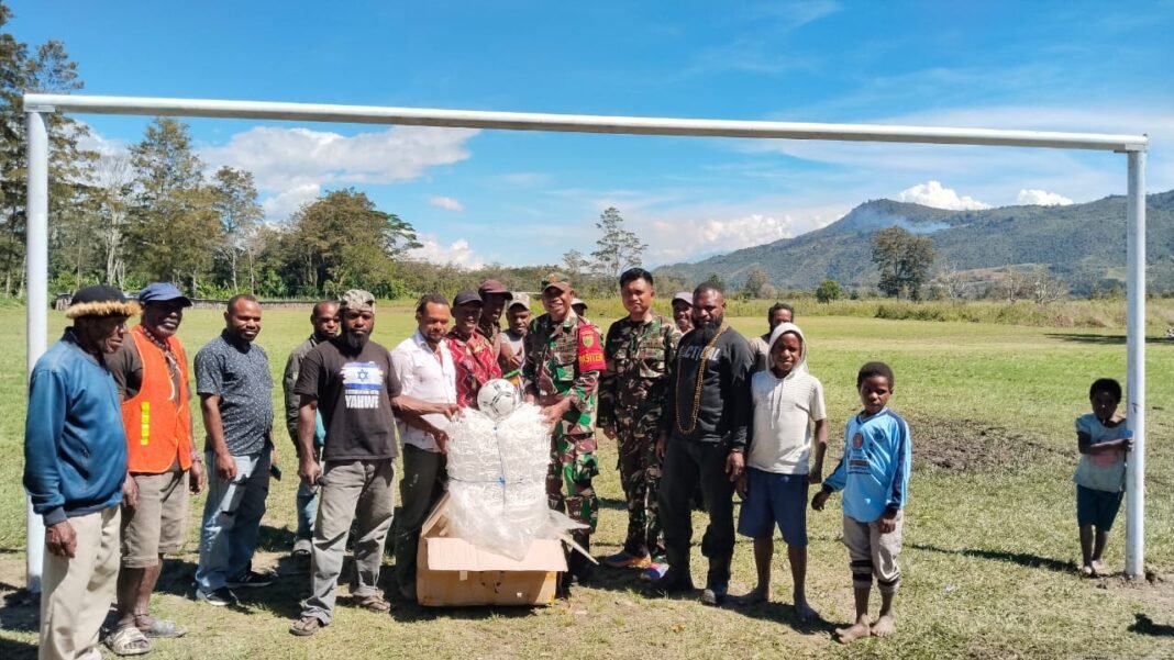 Wamena, investigasi.news– Dalam rangka mendukung pengembangan potensi generasi muda dan mempererat tali persaudaraan dengan masyarakat, Satgas TMMD Ke-126 Kodim 1702/Jayawijaya menyerahkan bantuan berupa bola dan jaring gawang kepada pemuda Kampung Algonik, Distrik Piramid, Kabupaten Jayawijaya. Jumat (17/10/2025).