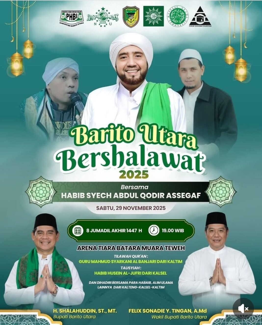 Muara Teweh, Investigasi.news 17 November 2025 – Pemkab Barito Utara mengajak masyarakat untuk mengikuti gelaran acara shalawatan. Mari bersama-sama ramaikan dan sukseskan acara Barito Utara Bershalawat 2025! Ajak keluarga, kerabat, dan teman-teman untuk hadir dan merasakan indahnya lantunan shalawat bersama Habib Syech Abdul Qodir Assegaf.