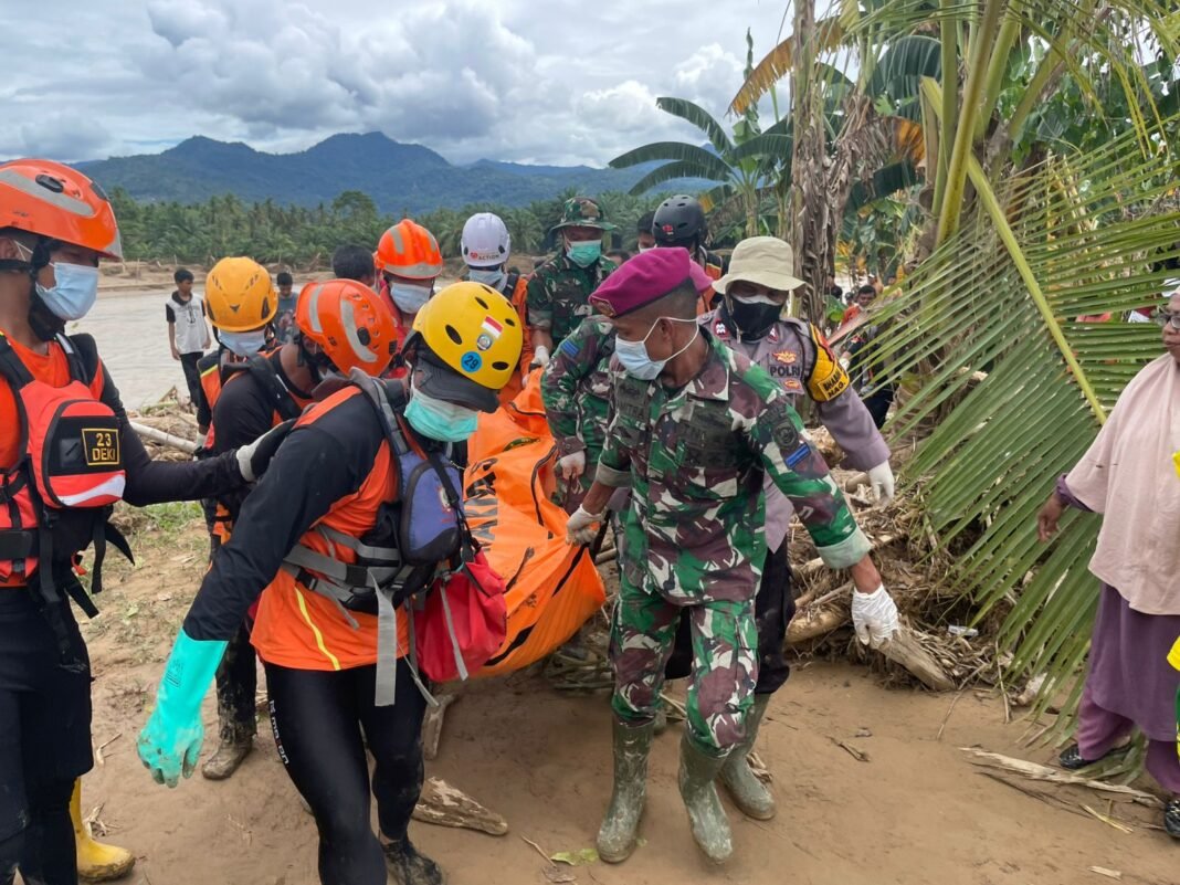 Mendapat informasi tersebut, Babinsa Sertu S.Z. Damorta bersama personel Marinir, Bhabinkamtibmas, dan tim Basarnas segera langsung bergerak menuju ke lokasi tempat kejadian perkara (TKP) untuk melakukan proses evakuasi. Proses evakuasi mengalami kendala cukup berat karena kondisi mayat terjepit di antara gelondongan kayu besar yang terbawa arus banjir,” ungkapnya.