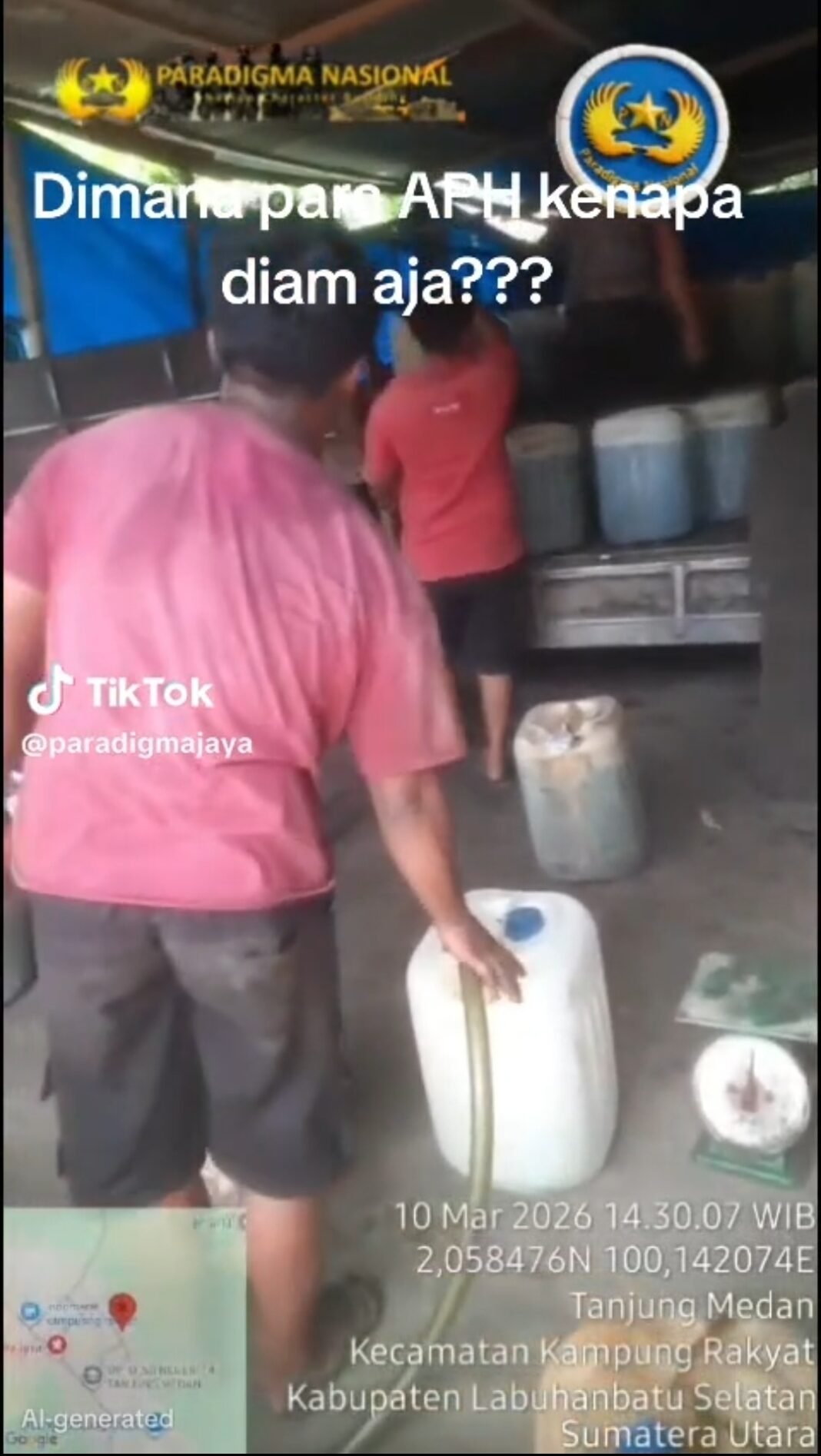 Pasalnya, dalam video yang diunggah media online Paradigmanasional.id di akun tiktoknya, menunjukan, adanya aktifitas sejumlah pria dengan banyaknya jeregen dan babytank, serta mobil pick up dan truk fuso, juga saat satu unit sepeda motor dengan muatan jeregen berada di lingkungan halaman sebuah rumah. Dalam video tersebut, penunjukan lokasi jelas berada di Dusun Tanjung Mulia, Desa Tanjung Medan, Kecamatan Kampung Rakyat, Kabupaten Labuhanbatu Selatan, Sumatera Utara, pada tanggal 10 Maret 2026, dan sudah beredar luas.
