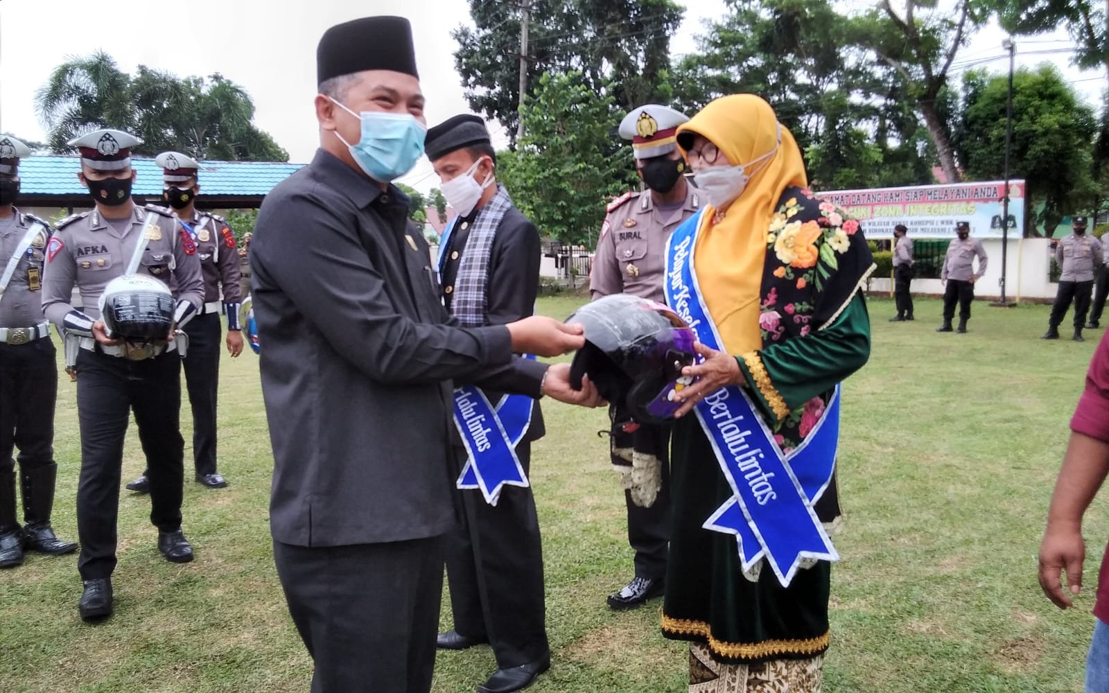 Selanjutnya, setelah pelaksanaan kegiatan Apel gelar pasukan dilanjutkan dengan pemasangan selempang pelopor keselamatan berlalu lintas dan pemberian Helm SNI kepada Duta Pelopor keselamatan berlalu lintas.