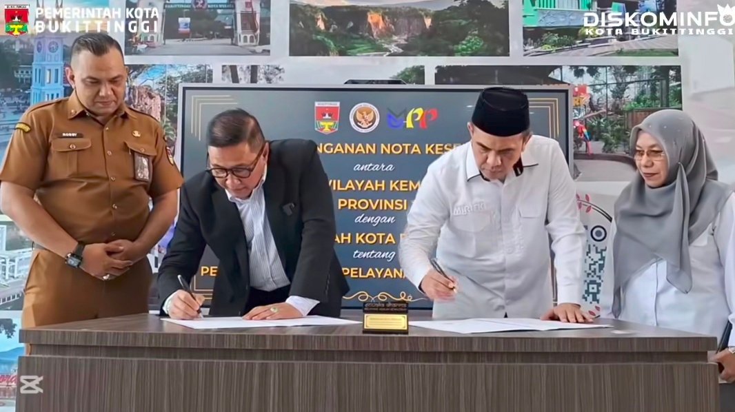Bukittinggi — Pemerintah Kota Bukittinggi bersama Kantor Wilayah Kementerian Haji dan Umrah Provinsi Sumatra Barat tandatangani Perjanjian Kerja Sama tentang penyelenggaraan pelayanan haji dan umrah. Penandatanganan MoU dilaksanakan di Mall Pelayanan Publik Kota Bukittinggi, Senin, 19 Januari 2026.